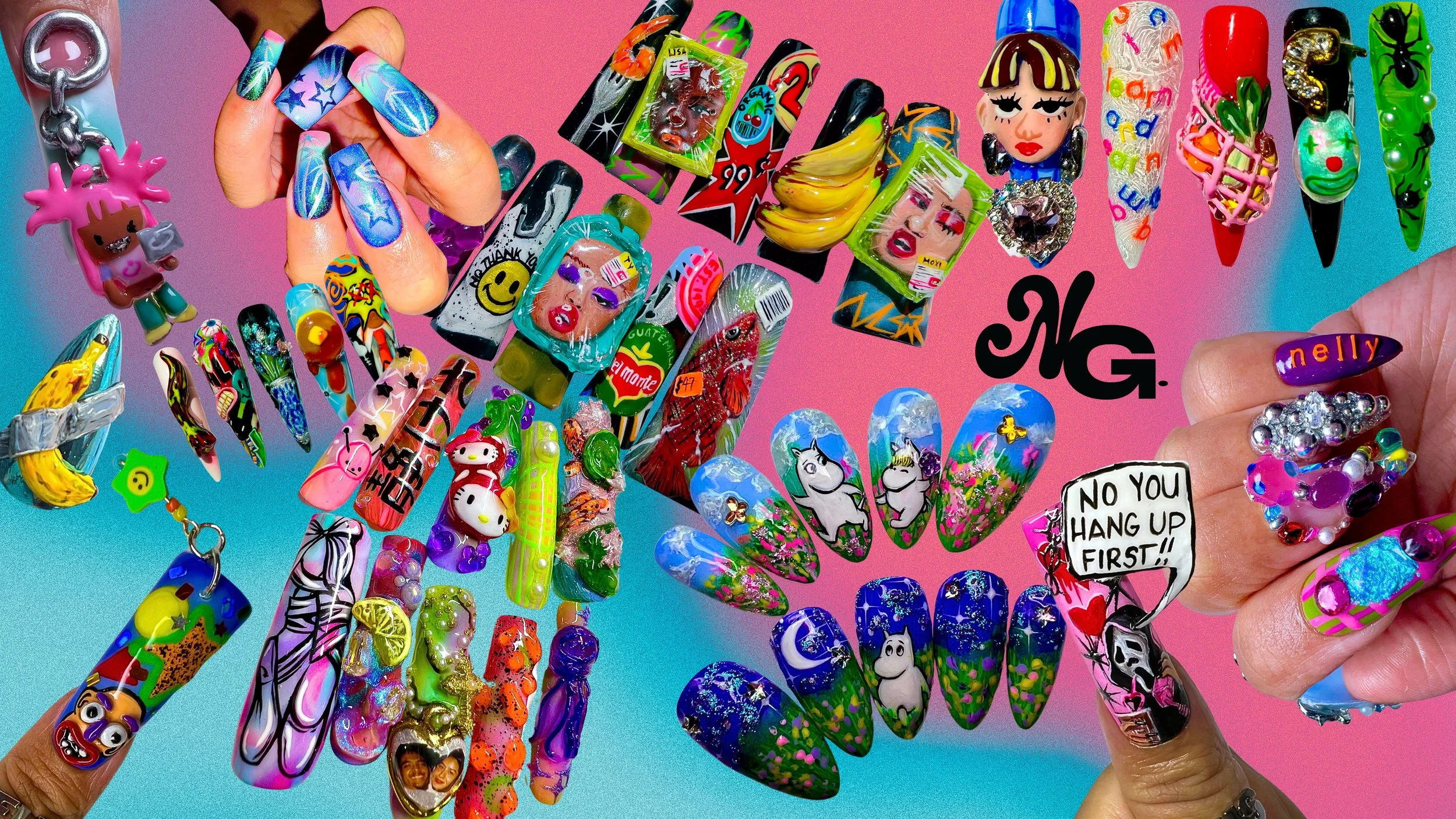 Patterns, Airbrush, chrome, cat eye, charms, jewels, stickers, pearls, & glitter.